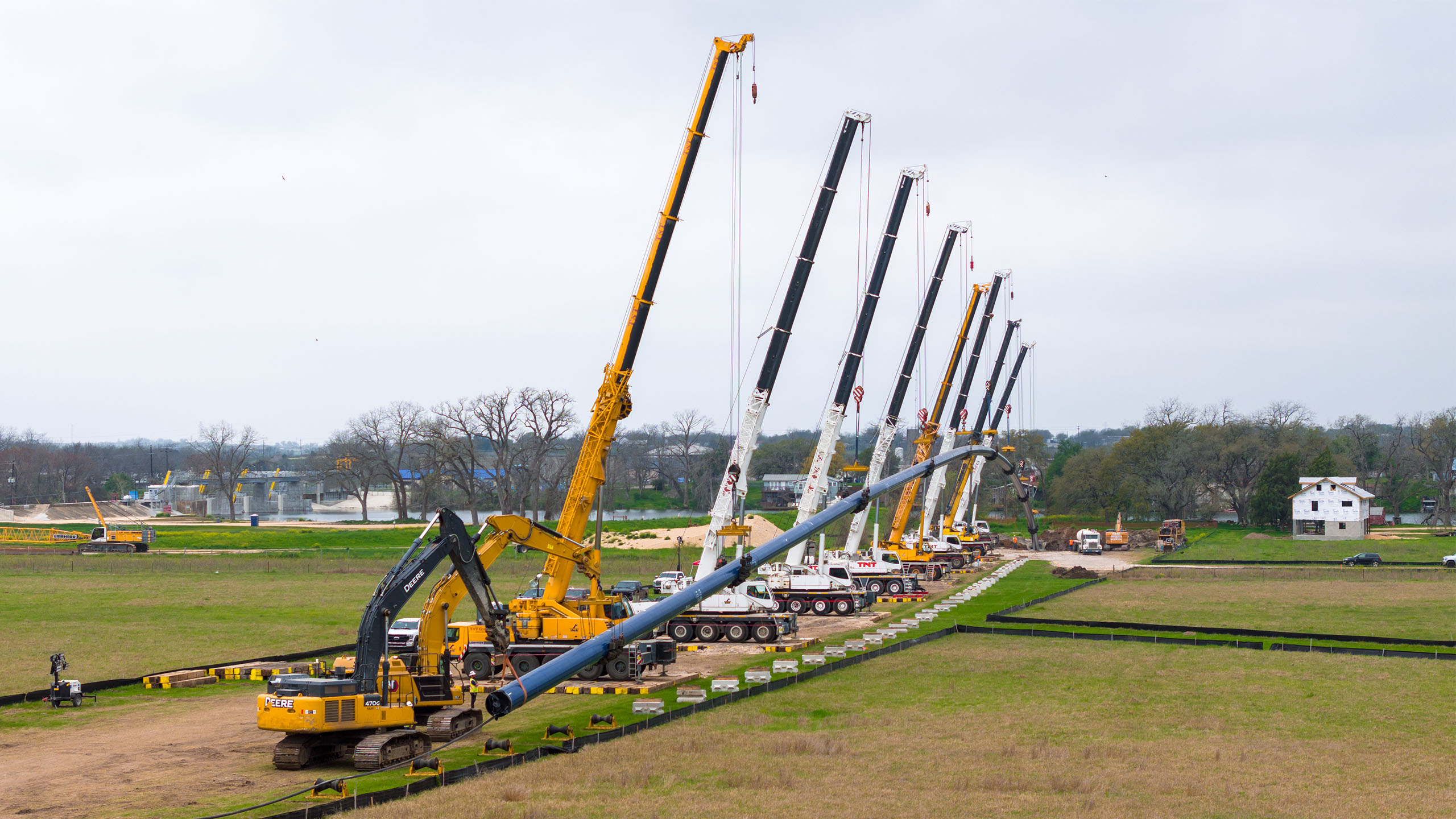 The project’s scope entailed installing a 36″ water pipeline beneath the Guadalupe River. This task encompassed horizontally drilling 1,579 feet at a diameter of 54″. The coordination of the lift and pull through required utilization of eight hydraulic all-terrain cranes, five track hoes, and three loaders. Choosing the right equipment for the task and then employing a great team of professionals to execute the work safely would deliver a successful project completion.